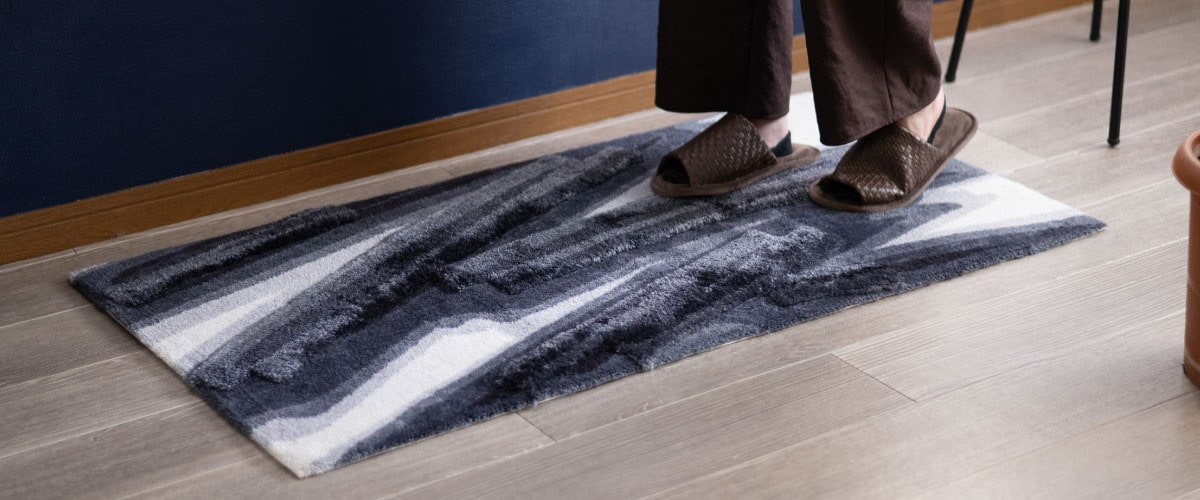「レイヤードマット」は、自社マット工場の手法や素材を駆使し一枚一枚丁寧に作られたベースと、日本の特殊なプリント技術を組み合わせることで、一味違う表情を見せるインテリアマットです。