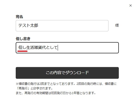 「領収書発行」をクリックし、領収書の宛名・但し書きを入力します。