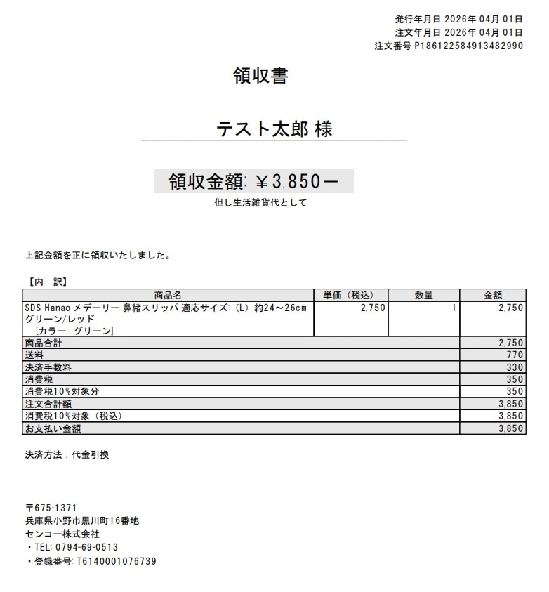 代金引換決済の場合は、ご注文商品到着時に配送員の方から手渡される伝票を領収書としてご使用いただきますようお願い申し上げます。